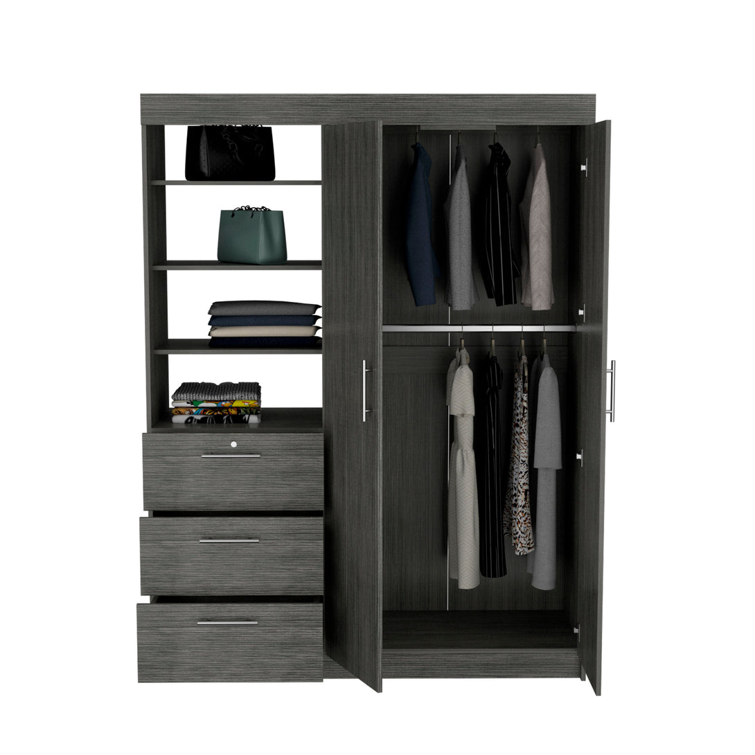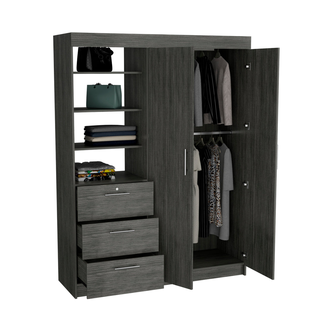 We know you like your comfort, so we created the perfect solution for storing all your clothes in one place- the Kenya 3 Drawers armoire! This armoire is ideal for small spaces and adds a modern touch to any room. The closet features two wide doors, two interior hangers, and three spacious drawers for all your clothes. The best part? Three 3-Tier Shelf that are perfect for displaying your favorite accessories or items!