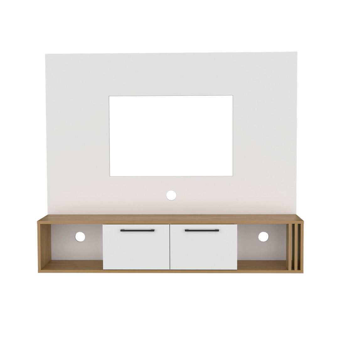 Transform your living space with the sleek and functional Floating Entertainment Center, designed to elevate both style and organization. This modern unit features a base shelf with two cabinets and two open shelves, each equipped with cable management holes to keep your media area tidy and clutter-free. The backing of the entertainment center includes an open space, allowing for easy installation of a TV rack support and additional cable management for devices placed on the top shelf.